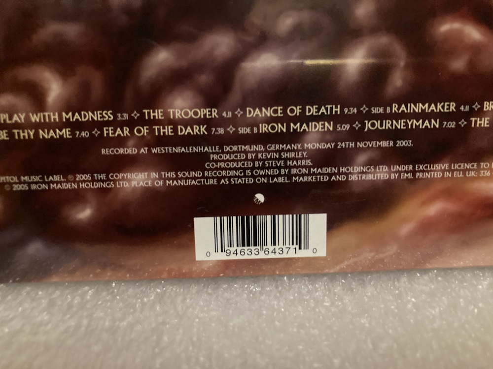 IRON MAIDEN Death On The Road (edición limitada del Reino Unido de 2005, LP doble con 16 pistas y disco ilustrado que incluye una grabación de su actuación en directo el 24 de noviembre de 2003 en el Westfalenhalle Arena de Dortmund, Alemania, durante la gira europea Dance of Death. Presentado en una funda desplegable con pegatinas promocionales y con un diseño interior de Eddie en tonos oscuros. Ten en cuenta que esta edición tiene el logotipo de EMI en la parte posterior de la funda y en las etiquetas, mientras que la reedición tiene el de Parlophone.
