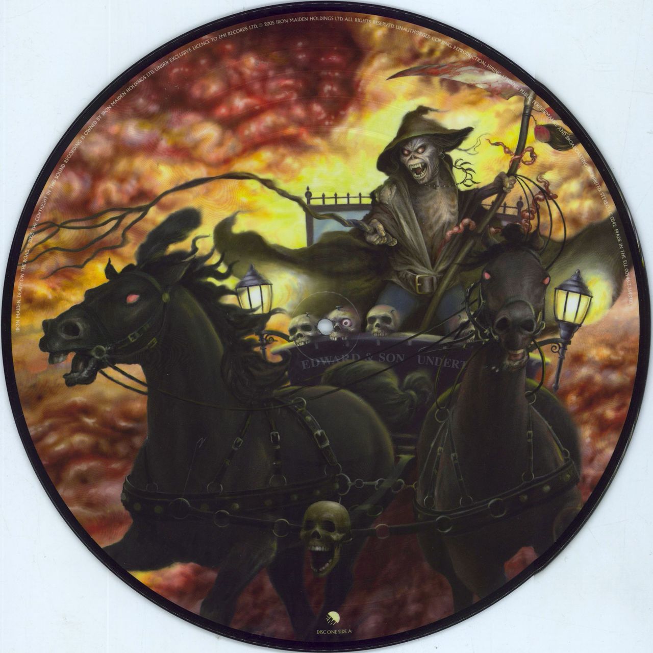 IRON MAIDEN Death On The Road (2005 UK limited edition 16-track double Picture Disc LP featuring a recording of their live performance on 24th November 2003, at Westfalenhalle Arena in Dortmund, Germany during the Dance of Death European Tour. Housed in a hype-stickered gatefold picture with inners that feature a dark Eddie design. Please note that this issue has an EMI logo on the back of the sleeve and the labels, the reissue has Parlophone.